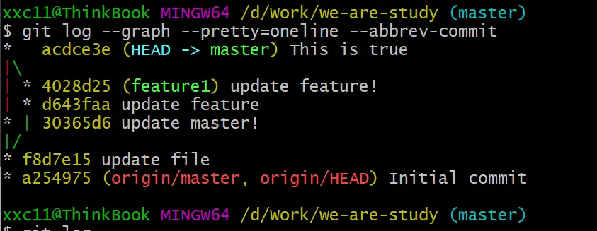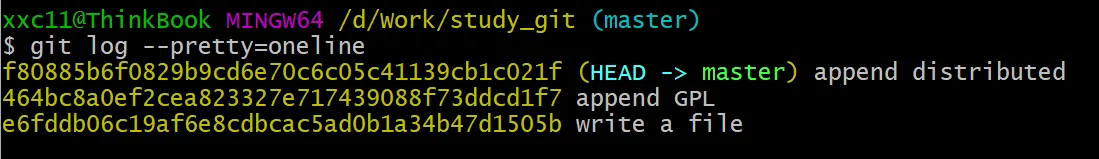 此命令可以简化日志的输出。从下往上看,依次显示每次的提交内容,最上面为当前的最新版本。
