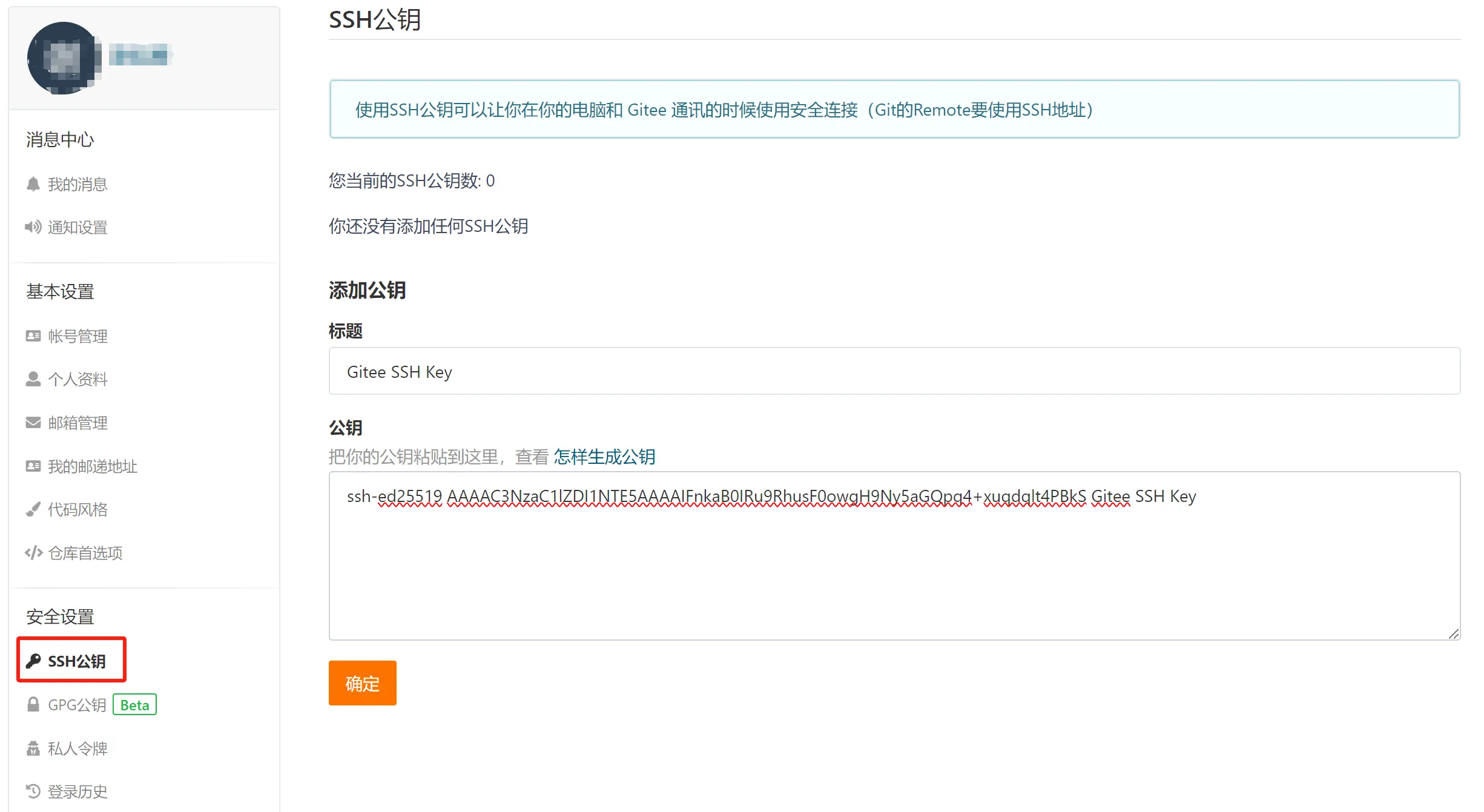 说明:当你第一次使用Git的clone或者push命令连接Gitee时,会得到一个警告,这是因为Git使用SSH连接,而SSH连接在第一次验证Gitee服务器的Key时,需要你确认Gitee的Key的指纹信息是否真的来自Gitee的服务器,输入yes回车即可。Git会输出一个警告,告诉你已经把Gitee的Key添加到本机的一个信任列表里了。