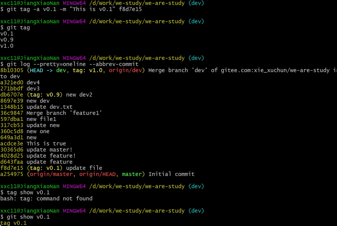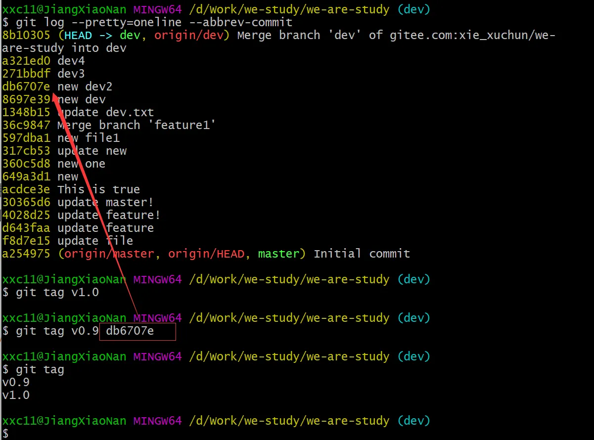 在Git中打标签非常简单,首先,切换到需要打标签的分支上,比如dev分支: