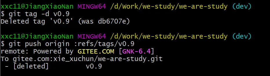 如果标签已经推送到远程,要删除远程标签就麻烦一点,先从本地删除: